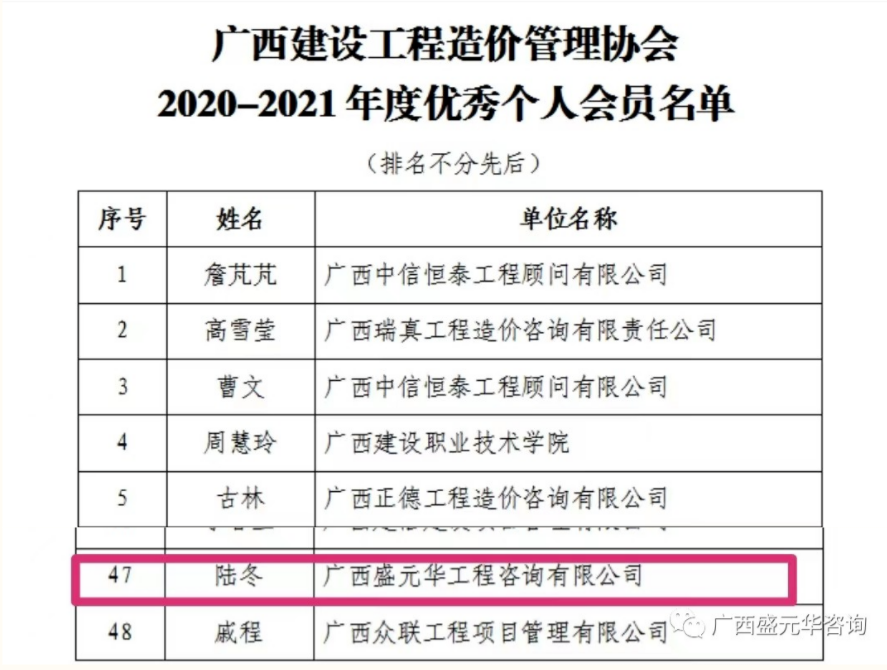 2022年7月5日,廣西建設(shè)工程造價(jià)管理協(xié)會發(fā)布《關(guān)于公布2020-2021年度先進(jìn)單位會員和優(yōu)秀個(gè)人會員的通知》,表彰了經(jīng)過專家委員會評定、名單公示等嚴(yán)格程序最終評選出的46家“先進(jìn)單位會員”及48名“優(yōu)秀個(gè)人會員”。廣西盛元華再次脫穎而出,榮獲“2020-2021年度先進(jìn)單位會員”榮譽(yù)稱號。同時(shí),我公司副總經(jīng)理、司法鑒定中心主任陸冬榮獲“2020-2021年度優(yōu)秀個(gè)人會員”榮譽(yù)稱號。